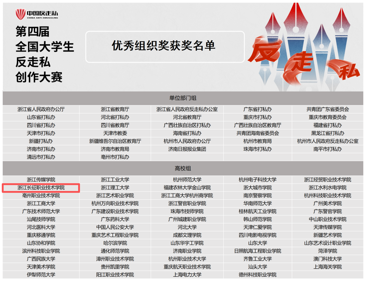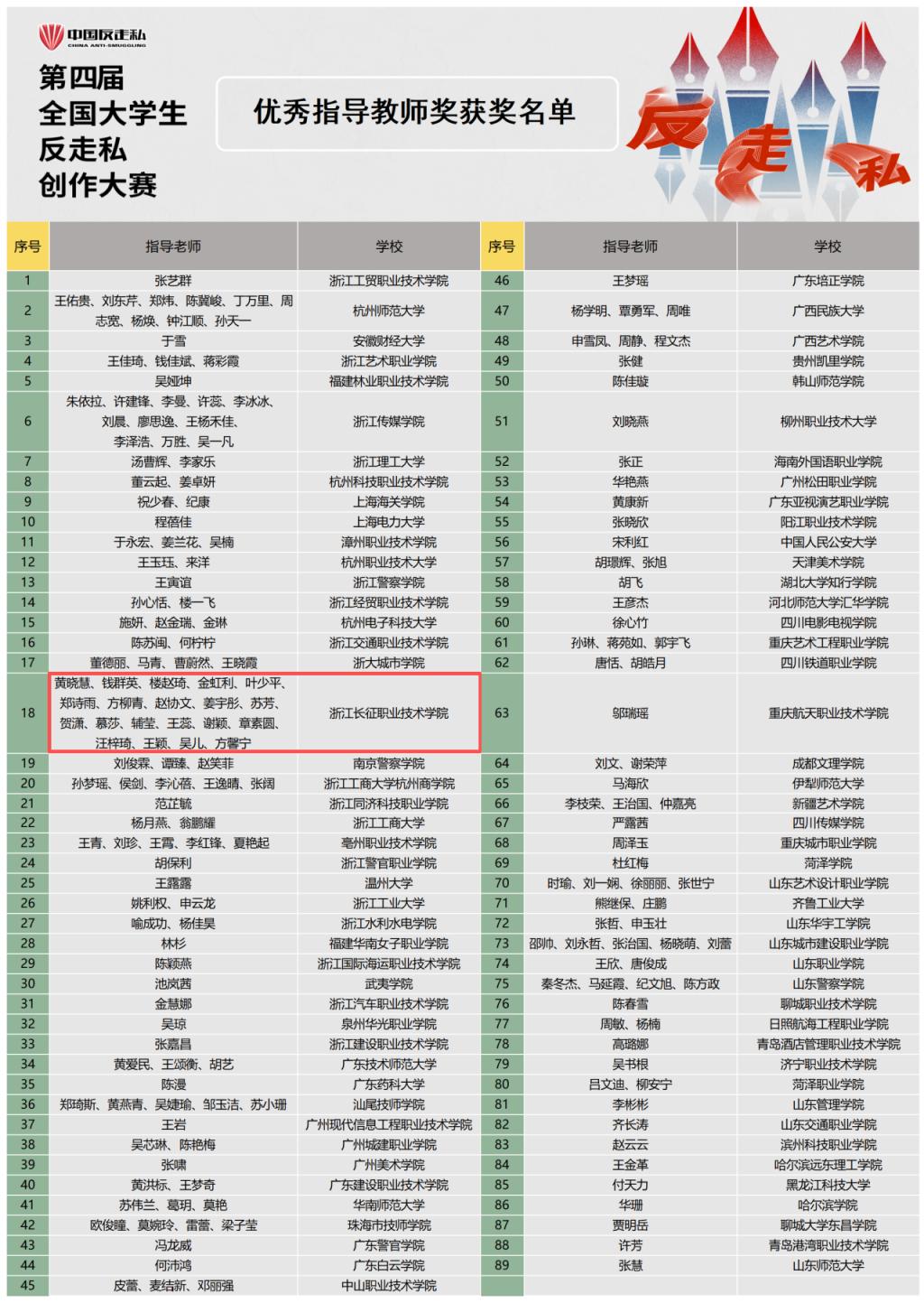 近日,第四届全国大学生反走私创作大赛圆满落幕。我校师生在此次全国性赛事中表现亮眼,共有194件作品入围,黄晓慧等20名教师荣获“优秀指导教师奖”,学校获评“优秀组织奖”,全方位展现了长征学子的良好精神风貌与强烈社会责任感。